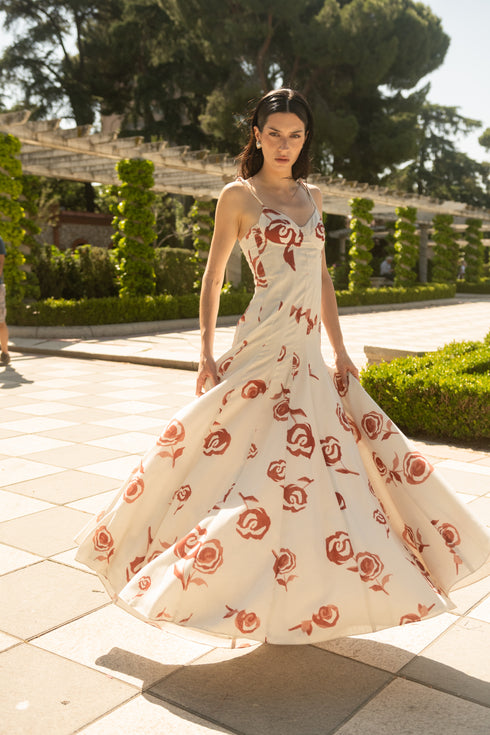 Nuestro vestido Rosetta maxi presenta formas modernas con una feminidad romántica. Confeccionado en un algodón liviano, este femenino y alegre vestido está detallado con un estampado de rosas original de nuestra marca, cortes y copas en el busto que acentúa la silueta. Combínalo con un par de sandalias de tacón bajo sofisticado.
